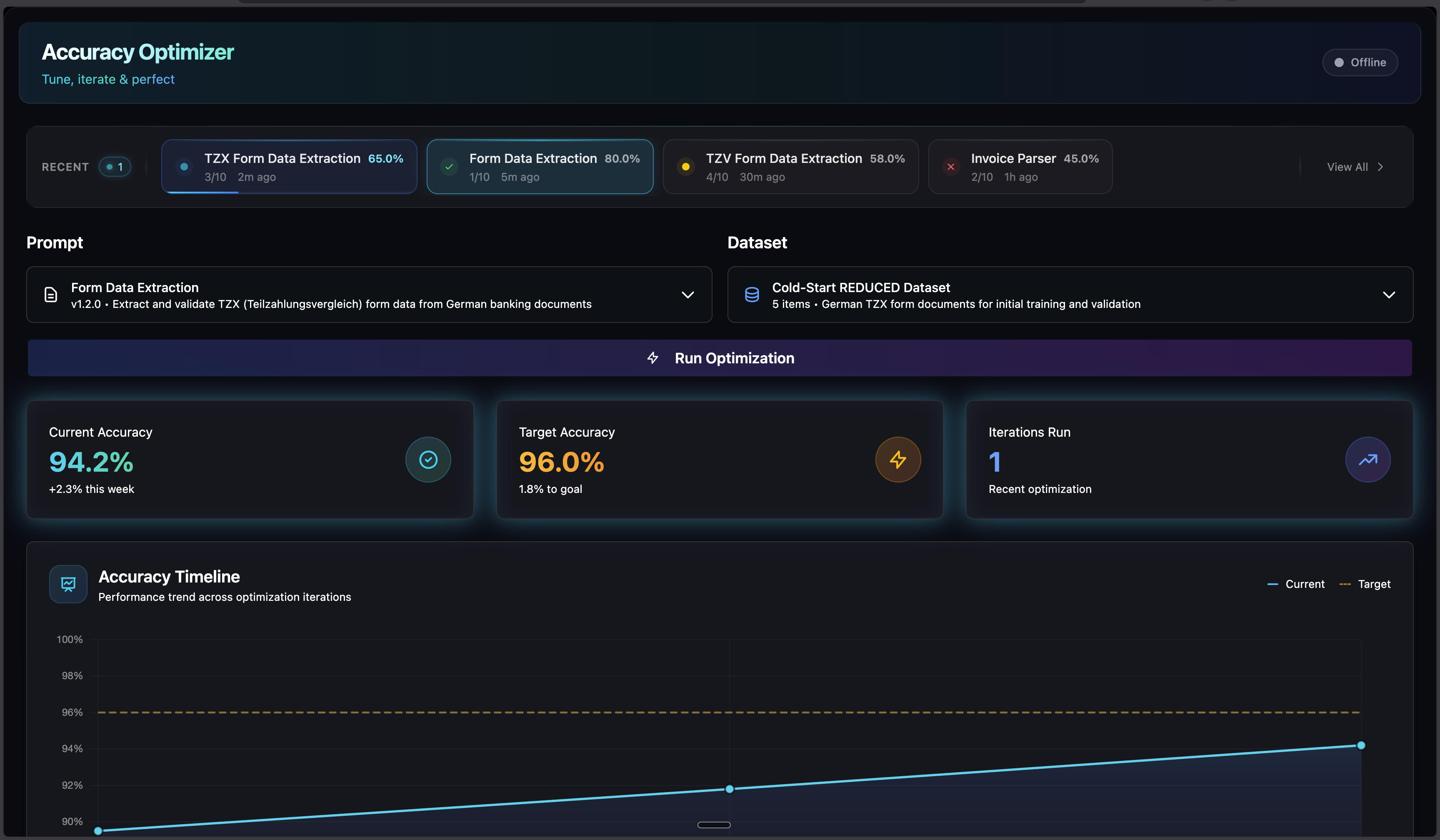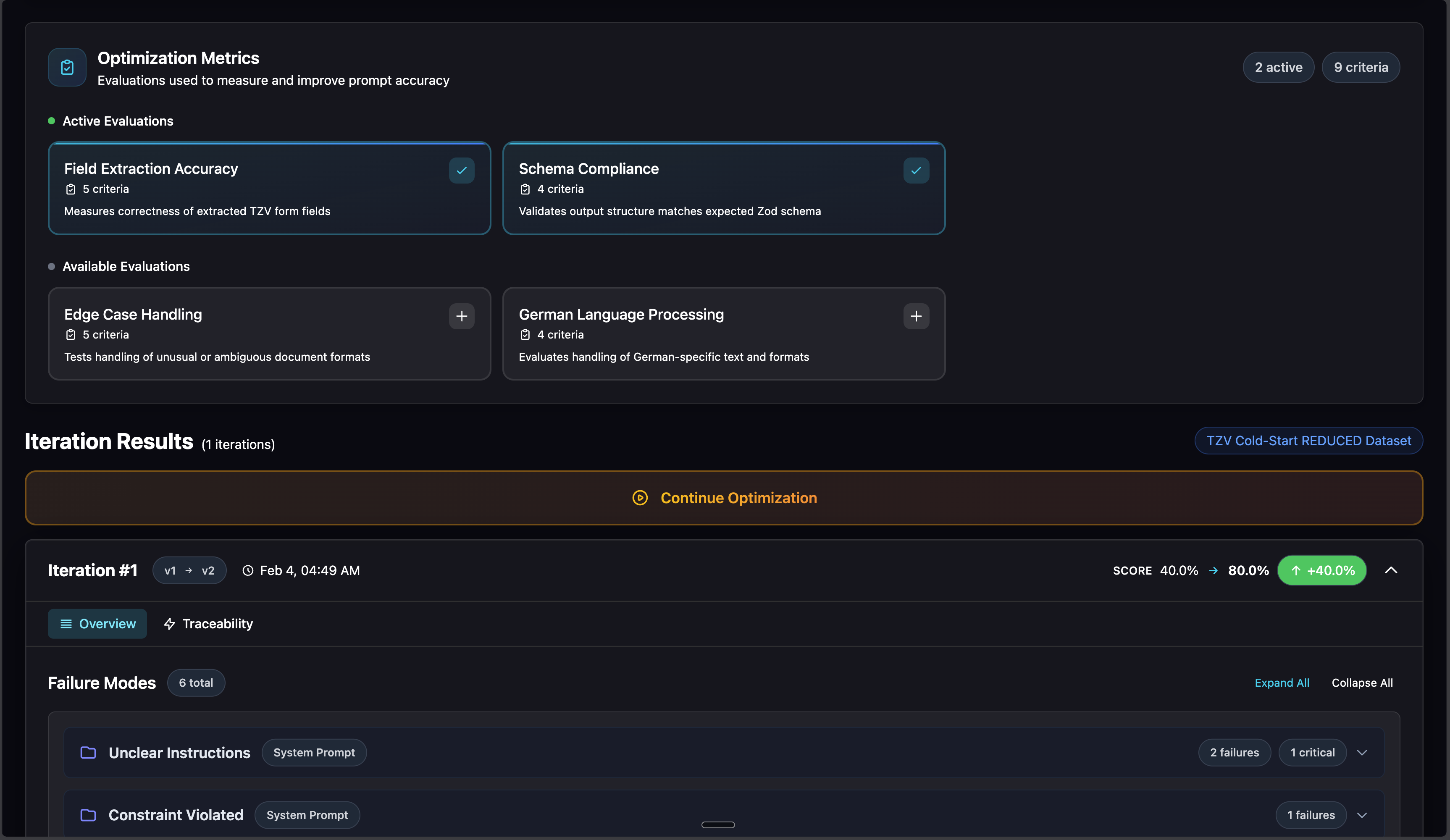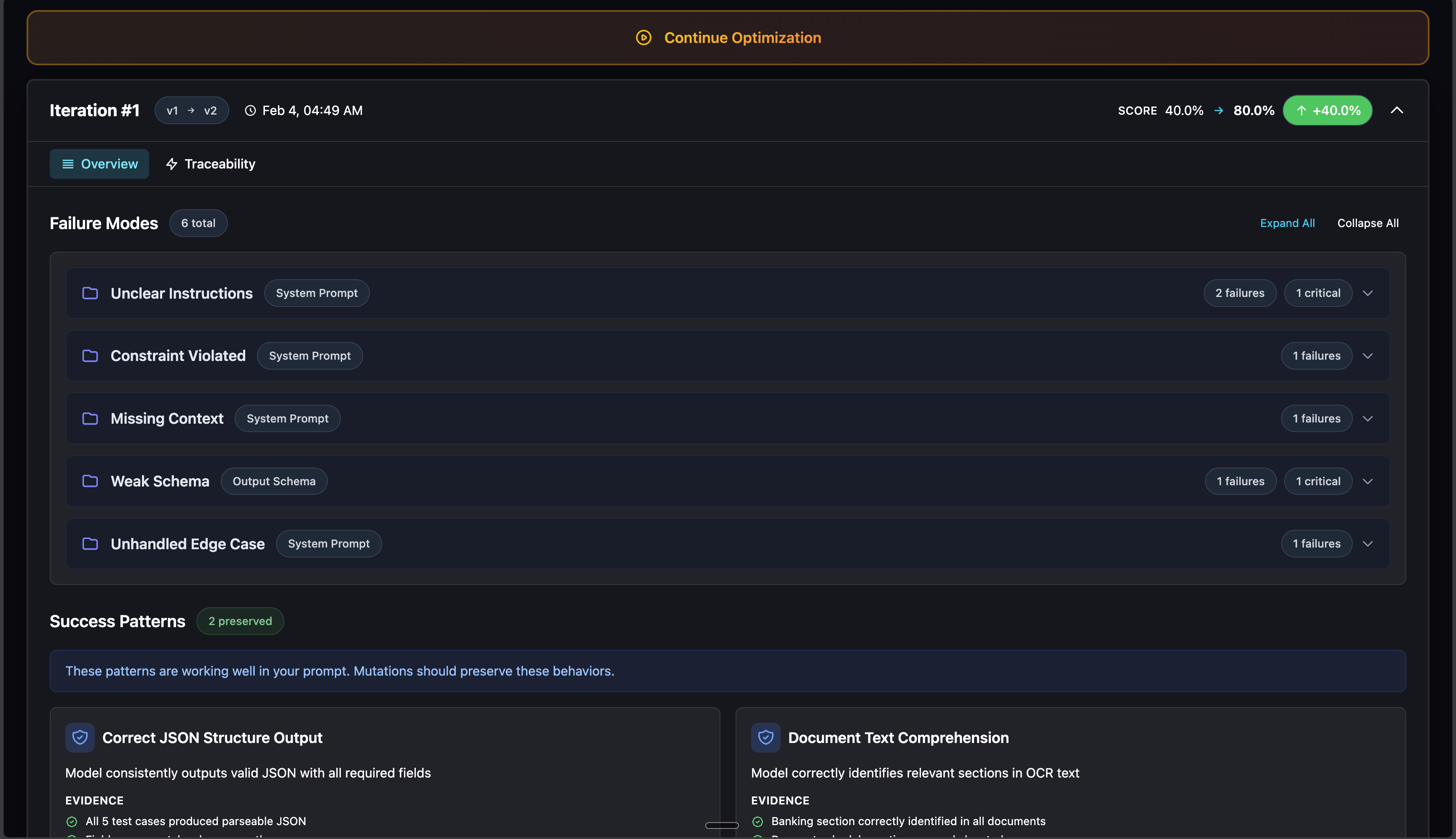Review the optimized prompts and apply them. See before/after metrics. Then start the next optimization cycle.