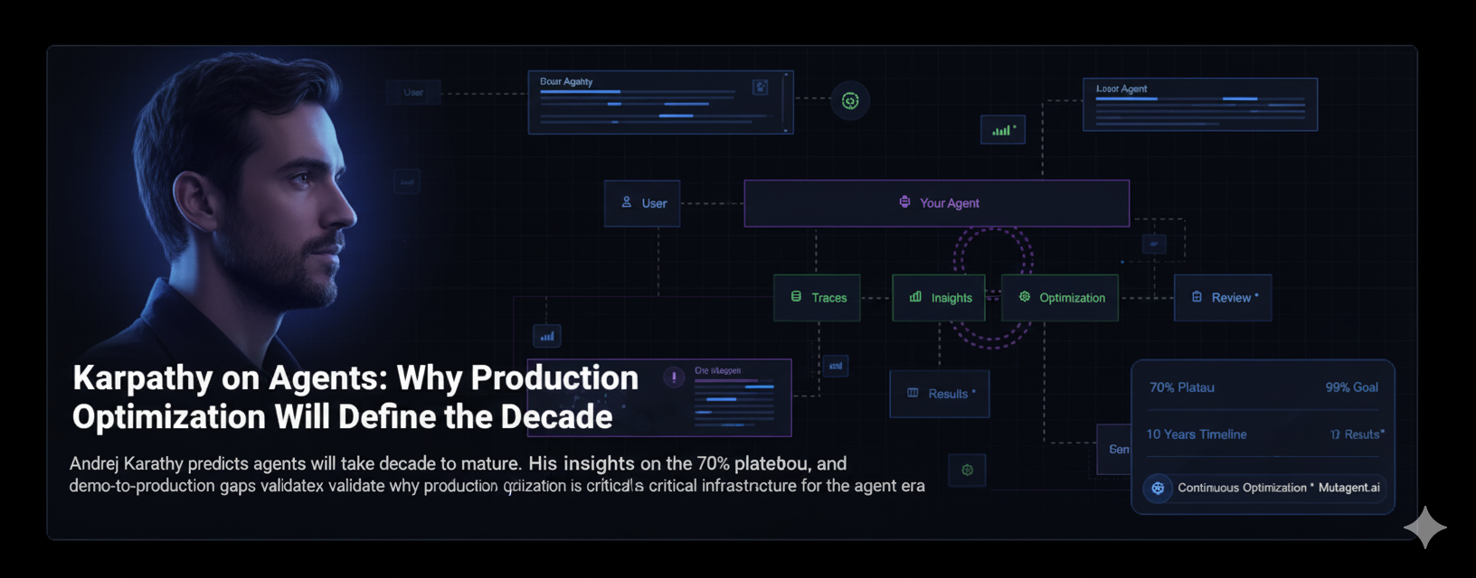 Andrej Karpathy predicts agents will take a decade to mature. His insights on the 70% plateau, RL limitations, and demo-to-production gaps validate why production optimization is critical infrastructure for the agent era.